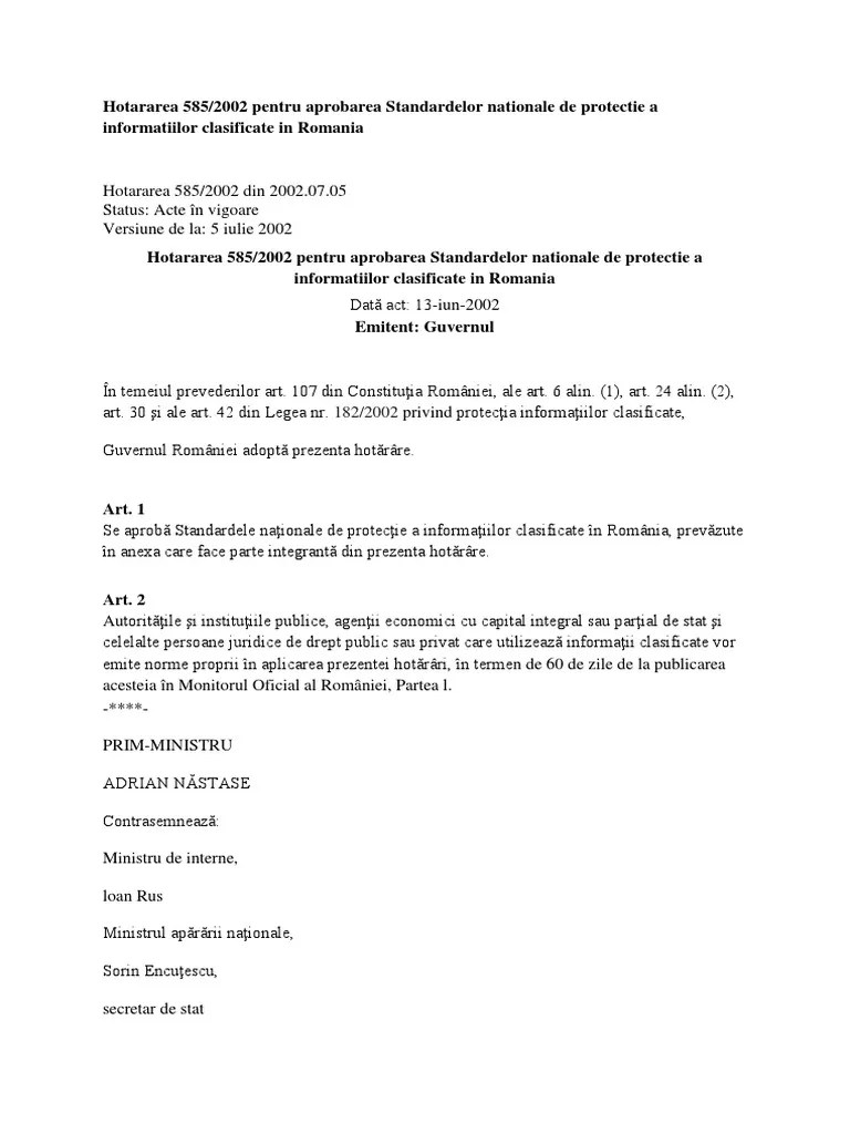 585 din 13 iunie 2002 pentru aprobarea standardelor nationale de protectie a informatiilor clasificate in romania emitent:.. 107 din constituția româniei, ale art. 485 din 5 iulie 2002. 585 din 13 iunie 2002 pentru aprobarea standardelor naţionale de protecţie a informaţiilor clasificate în românia în temeiul prevederilor art. Publicat în monitorul oficial nr.